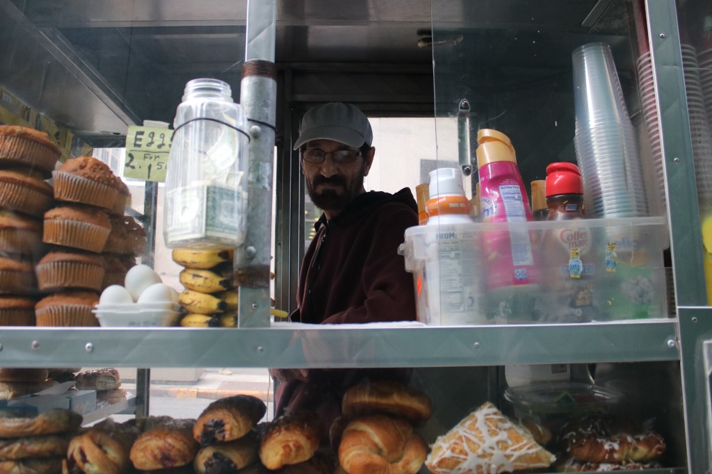 Ghulam Afshar, 60, depends on his coffee cart to support family members in New York, Iran, Pakistan, and Afghanistan. He is experiencing a decrease in customers after the pandemic.